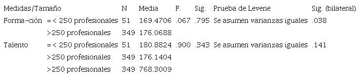 En cambio, el comportamiento de la variable Gestión del Talento es distinto, pues las empresas de menor dimensión tienen una media de valoración más alta (180.88) que las grandes (176.14), sin ser significativas dichas diferencias. Por tanto, se puede concluir que el tamaño de las empresas no es relevante en la Gestión del Talento.