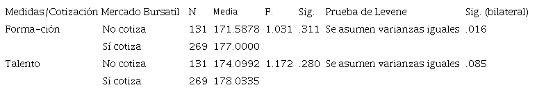 Lo mismo se puede concluir al relacionarlo con la cotización bursátil de las empresas, las que cotizan tienen mayores valores medios relevantes en la Formación. En el caso el Talento presenta una sig bilateral del 0.085 (tabla 8) valor muy cercano a la significatividad. Se puede concluir que las empresas que cotizan en bolsa presentan mejores resultados en ambas variables y relevantes, lo cual constituye un hallazgo novedoso.
