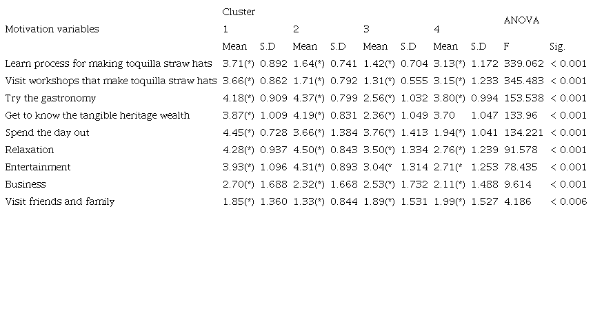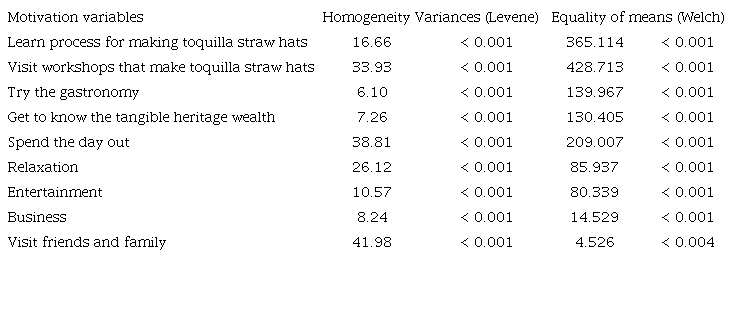 The study of the motivations provides the basis for establishing a segmentation of the tourists that arrive in Cuenca. Thus, a non-hierarchical cluster analysis was conducted with the factorial scores of the three extracted dimensions, under the criterion of maximising the variance between types and minimising the variance within each of them. The best solution that meets the criteria is that which establishes four clusters for segmenting the tourists that visit the city of Cuenca. Table 2 shows the characterisation of the clusters from the means of the motivation variables. The ANOVA F-statistic tests that the compared means are not equal, but it does not allow specifying where the detected differences are found. In order to know which mean differs, a particular type of test called post hoc multiple comparisons or a posteriori comparisons was applied. In carrying out the comparisons, it cannot be assumed that the population variances are equal, the critical level associated to Levene’s test statistic is less than 0.05 for all cases and, therefore, the equality of variances is rejected. The ANOVA F-statistic is based on the fulfilment of two suppositions (normality and homoscedasticity), and given that it is not possible to assume that the population variances are equal, Welch’s test statistic is used as an alternative to the ANOVA F-statistic (table 3). The critical level associated with this statistic is less than 0.05 and, therefore, the hypothesis of equality of means can be rejected and it can be concluded that the averages of the motivational variables of the four compared clusters are not equal.
