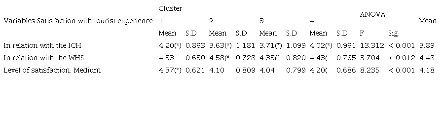 The results reveal a positive assessment of the experience by the four identified tourist clusters (table 5). The robustness tests on the means of the variable satisfaction show that the averages among the four compared clusters are not equal (table 6). Thus, the assessment is higher in the first cluster, which corroborates the greater relevance of the cultural dimensions, the satisfaction with the trip seems to increase as the desire to know both the tangible and the intangible heritage prevails over the rest of the motives for visiting the city. The third cluster shows that those tourists with a higher hedonic motivation assess to a lesser degree their tourist experience. The level of satisfaction of the fourth group also shows evidence of a greater joint effect of the cultural dimensions.