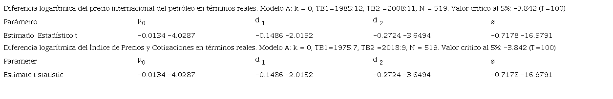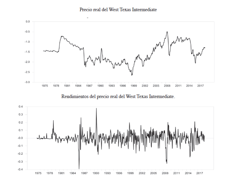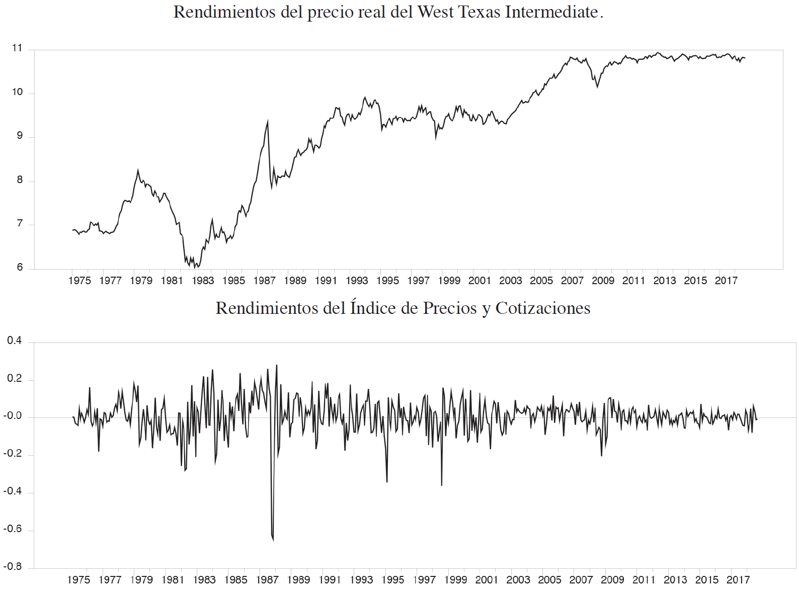 Los rendimientos del precio internacional del petróleo se calcularon a partir del precio del West Texas Intermediate (WTI), el cual se obtuvo de dos fuentes: de enero de 1975 a diciembre de 1985 se tomó de Balcilar, Gupta y Miller (2015) mientras que de enero de 1986 a septiembre de 2018 la serie proviene de la Administración de Información Energética de Estados Unidos (EIA)1, para expresarlo en términos reales se deflacto con el índice de precios al consumidor de los Estados Unidos. Mientras que los rendimientos del mercado accionario se obtuvieron del Índice de Precios y Cotizaciones (IPC) expresado en moneda local y en términos reales de la Bolsa Mexicana de Valores (BMV), esta última serie se extrajo de Economatica. De esta manera se cuenta con un total de 525 observaciones de las dos series. Ambas series de rendimientos se obtuvieron de sus primeras diferencias logarítmicas. Se opta por emplear los rendimientos en moneda local para aislar el efecto del tipo de cambio, Bass (2017) efectúa un procedimiento similar para el caso de Rusia, por el contrario Aye (2015) convierte el precio internacional de dólares al rand sudafricano con la finalidad de no ignorar el efecto del tipo de cambio. No obstante, Aye (2015) destaca que sus conclusiones se mantienen, independientemente de si el precio del petróleo se expresa en dólares o en la moneda local de Sudáfrica.