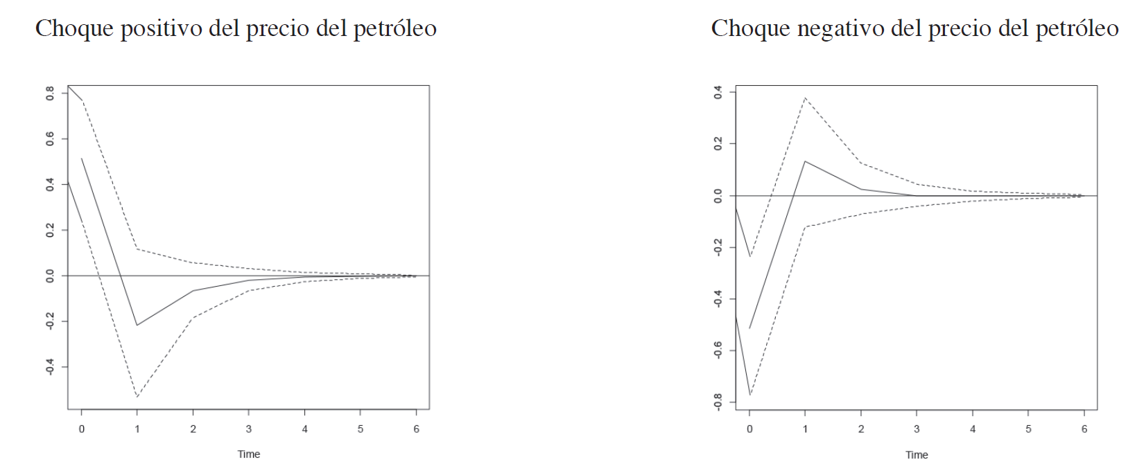Otro aspecto interesante que a los investigadores les ha llamado la atención es porque el impacto del precio de petróleo es asimétrico, es decir porque el impacto de un incremento del precio del petróleo no es el mismo que el de una reducción, Aye (2015). Sadorsdy (1999) provee dos posibles explicaciones acerca de los efectos asimétricos de los choques del precio internacional del petróleo en la actividad económica. La primera sugiere que lo importante es la magnitud de los cambios en los precios relativos. En tanto que la segunda tiene que ver con la irreversibilidad de la inversión bajo incertidumbre, y que hace hincapié en que hay un valor de opción asociado con la espera para invertir.