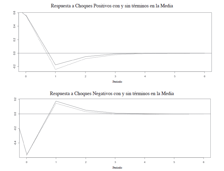 De igual forma, es posible probar efectos asimétricos de los choques del precio internacional real del petróleo en los rendimientos del mercado accionario en términos reales. Para tal fin, empleamos las funciones de impulso-respuesta. Las funciones de impulso-respuesta del VAR-GARCH en media se estiman de acuerdo a la propuesta de Elder (2003). Los intervalos de confianza se determinan de acuerdo con el método de Monte Carlo (Hamilton, 1994). Las respuestas a los choques simulados se derivan a través del método de máxima verosimilitud del modelo. A partir de los valores de los parámetros extraídos al azar de la distribución muestral de los estimadores de máxima verosimilitud, los intervalos de confianza se generan a partir de la simulación de 1000 funciones de impulso-respuesta.