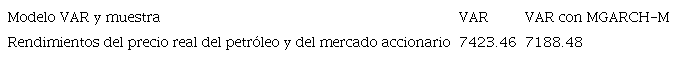 Los valores del criterio de Schwarz reportados en el cuadro 3 para los modelos VAR homocedastico y con efectos GARCH en la media, indican que el VAR con efectos GARCH en la media captura mejor las características de los datos en comparación al VAR homocedastico.