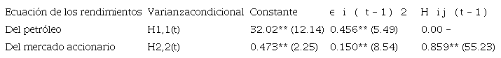 El modelo planteado en la ecuación (1) permite que la matriz condicional de desviaciones estándar impacten en la media condicional, lo cual permite verificar la hipótesis del impacto de la incertidumbre de los precios del petróleo en los rendimientos accionarios a través de la significancia de uno de los componentes la matriz Ω(M), dicho coeficiente se espera que resulte negativo y estadísticamente significativo.
