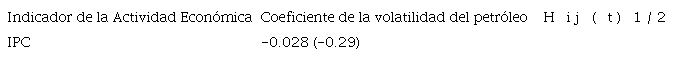 El efecto de la incertidumbre del precio internacional real del petróleo en los rendimientos del mercado accionario de México se presenta en la tabla 5. Dicha tabla muestra la estimación puntual del parámetro de interés y su estadístico t asintótico correspondiente entre paréntesis. Como se puede apreciar dicho coeficiente resultó negativo, pero no es significativo. De aquí se puede concluir que para el mercado accionario de México no hay evidencia de que la incertidumbre del precio internacional real del petróleo impacte negativamente en los rendimientos accionarios reales. Este resultado se contrapone a lo encontrado por la mayoría de los estudios efectuados para otros mercados.