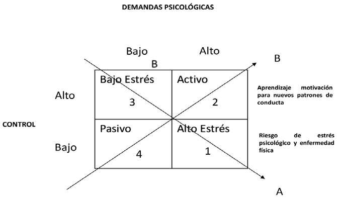 De acuerdo con González, Juárez, Camacho, Noriega y Escobedo (citados en Juárez, 2015) y en acuerdo con la propuesta general de la OIT/OMS (1984) el estrés laboral y sus consecuencias es el punto medular de interés para la comprensión de los factores de riesgo psicosocial por sus repercusiones tanto en la salud como en la productividad, y es en este contexto el modelo Demanda/Control de Karasek y Theorell (1990) es el que más ha contribuido significativamente a la comprensión de los mecanismos de afectación estresante y que explica efectos negativos o positivos de las demandas laborales y el control que el trabajador tiene sobre éstas. Este modelo propone que las demandas psicológicas y el control laboral predicen el riesgo a la salud mediante la combinación de cuadrantes, ver Figura 1