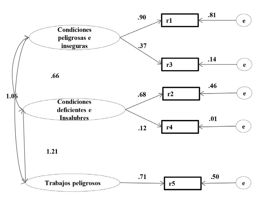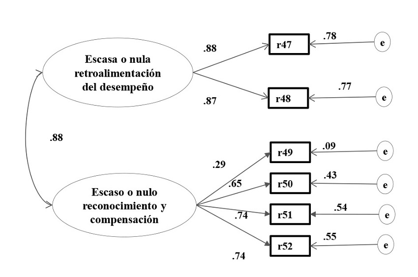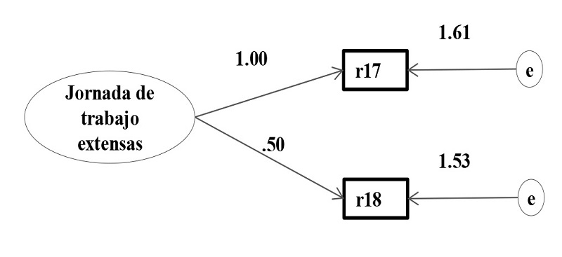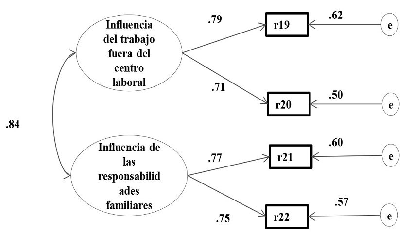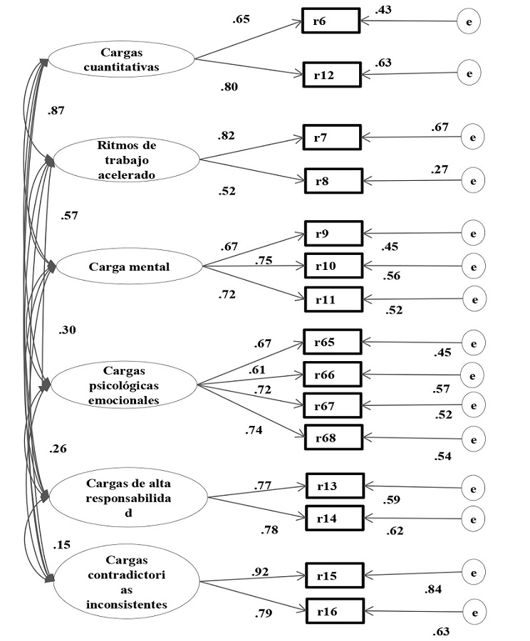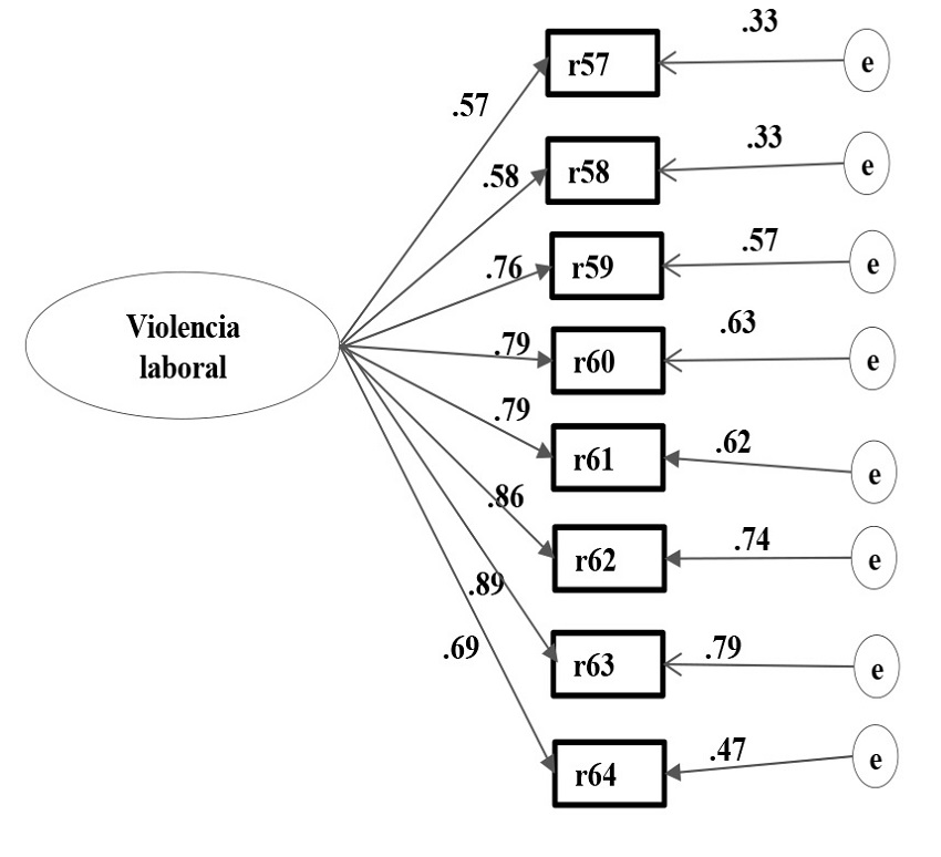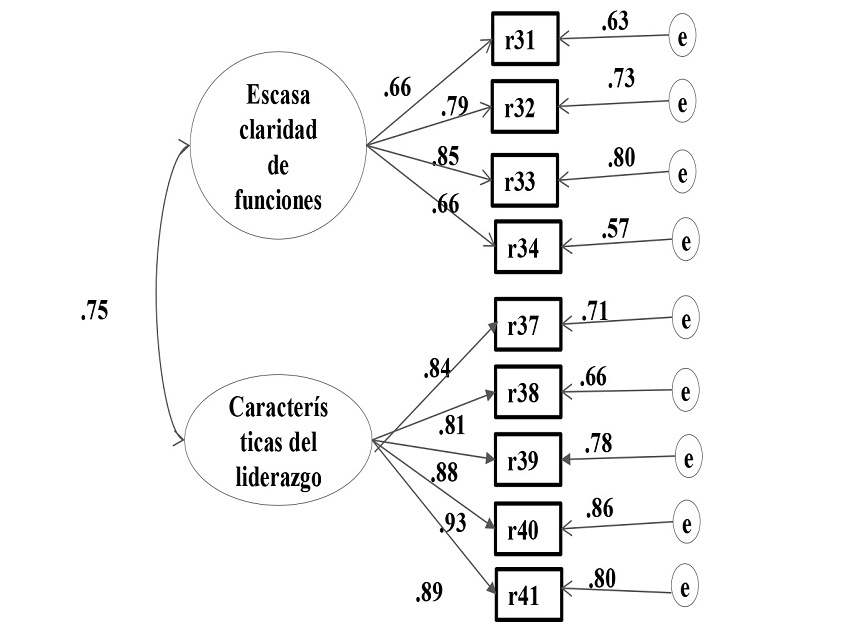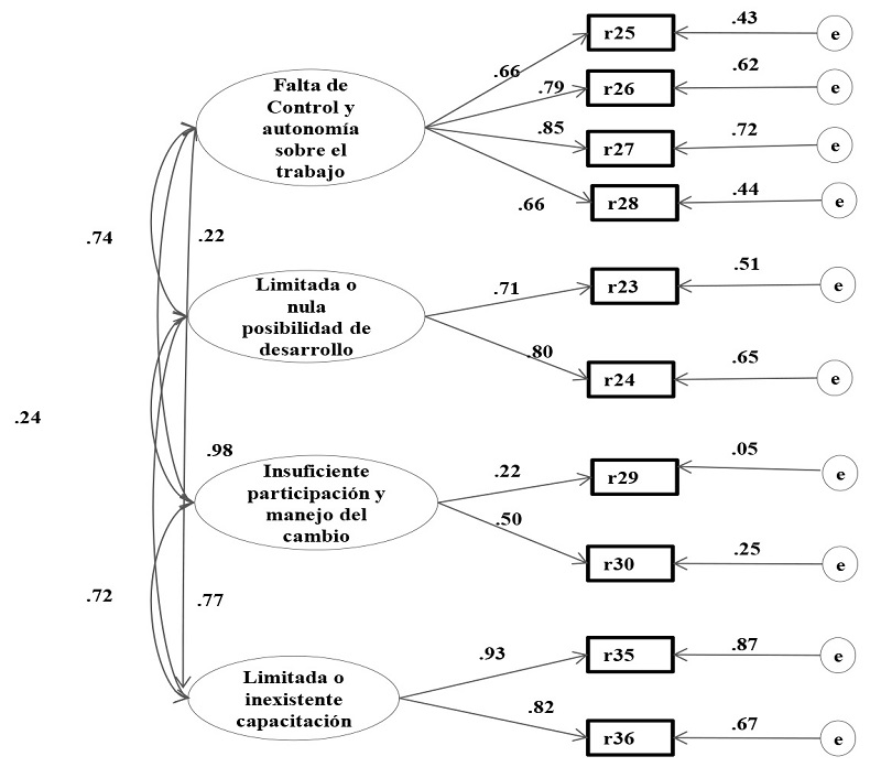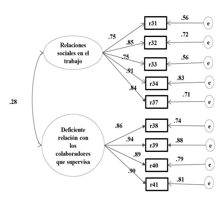 En dichos diagramas de las figuras anteriores se aprecian los 10 modelos correspondientes a los 10 dominios, los cuales representan factores a confirmar según lo propuesto por la STPS (2017) en la NOM 035; al mismo tiempo, en cada uno de ellos, se distinguen las variables latentes (dominios) y sus respectivas variables observables (ítems). También se distinguen las correlaciones que contiene cada relación entre observables y su latente, es decir, la relación entre varianzas y covarianzas.