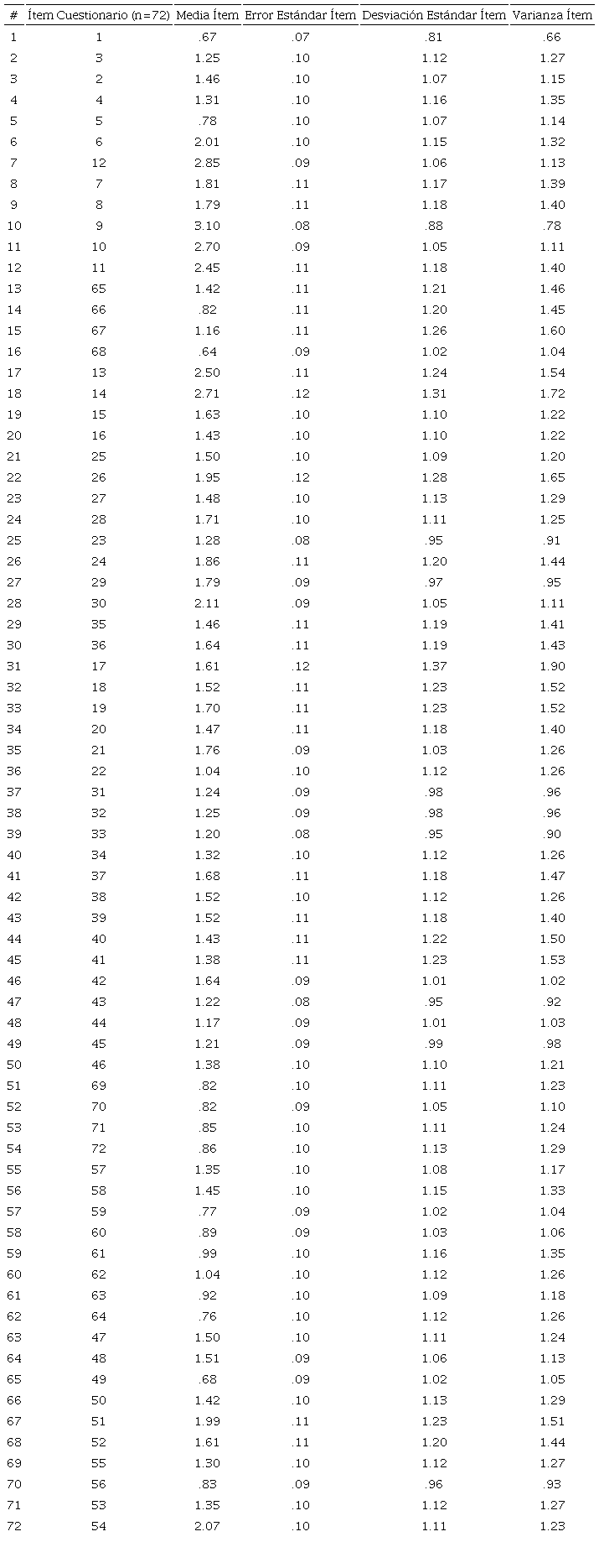 La escala GRIII es una escala multifactorial, por lo que su análisis se llevó a cabo en términos de factores, analizando 10 factores (dominios). Los primeros análisis de carácter descriptivo fueron: por ítem (Tabla 2), luego por dimensión, dominio, confiabilidad y categoría (ver Tabla 3)