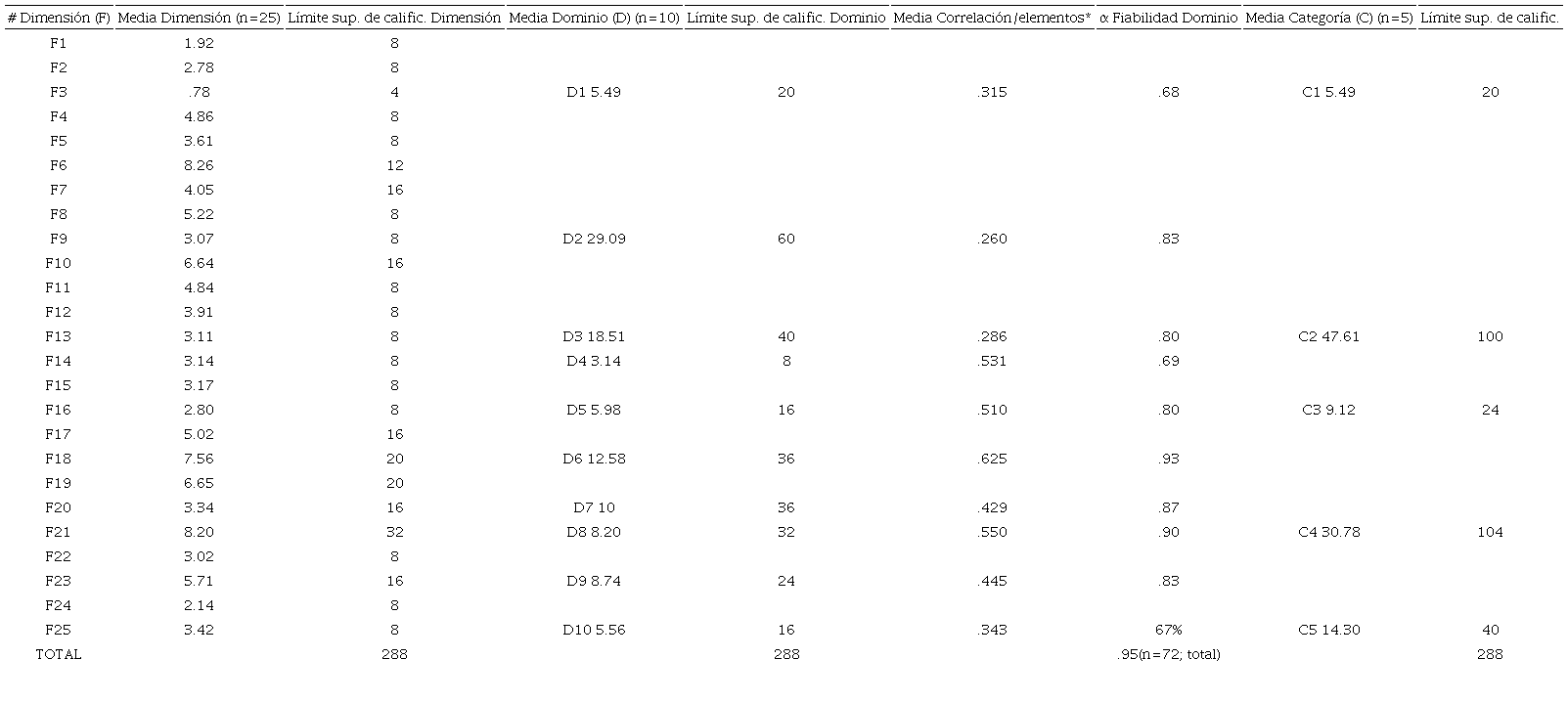 Con relación a la Tabla 3 pueden observarse tres elementos importantes: El primero se relaciona con una difícil comparación de la normalidad de los datos entre los límites superiores de sus rangos de calificación y las medias correspondientes a dimensiones, dominios y categorías, principalmente debido a que no hay un rango único de comparación, ya que mientras las medias de las 25 dimensiones varían entre .78 y 8.20, sus límites superiores lo hacen entre 4 y 32; de igual forma para los 10 dominios, sus medias fluctúan entre 3.14 y 18.51, mientras que sus límites superiores están entre 8 y 60; las categorías tienen medias entre 5.49 y 47.61, mientras sus límites superiores están entre 20 y 104. El segundo elemento, es tal vez uno de los indicadores más importantes de cualquier cuestionario, la fiabilidad; en este sentido el cuestionario GRIII obtuvo para los 10 dominios una confiabilidad fluctuante entre 67 y 93%, pudiéndose considerar como muy buenas, de manera general se obtuvo el 95% para los 72 reactivos. El tercer elemento se refiere a una apreciación global de todas las calificaciones, en realidad éstas no son comparables entre sí en virtud de que cada dimensión se compone de un número de reactivos diferentes (observar también Tabla 1), ya que existen dimensiones que contienen desde 1 reactivo hasta 32, de igual forma un dominio contiene desde una dimensión hasta cuatro y, por lo tanto, una categoría puede contener desde 3 dominios hasta 10.