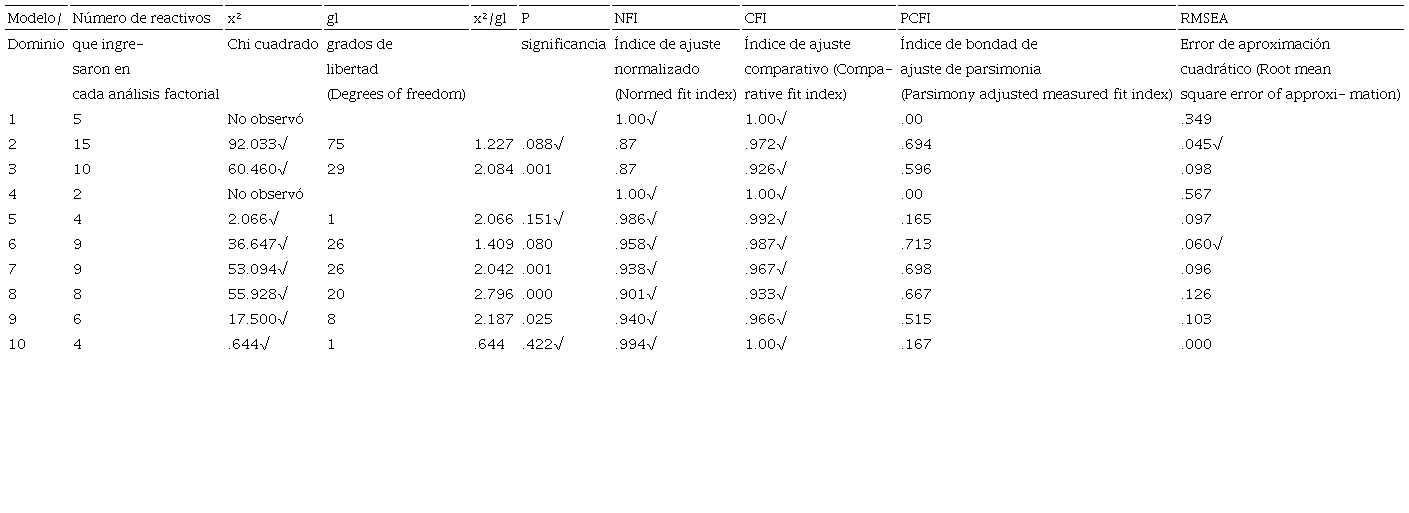 Como puede observarse en la Tabla 4 anterior se muestran 10 índices obtenidos en un primer análisis sin ajustar los modelos, ya que el objetivo de esta investigación fue conocer sus propiedades psicométricas antes de cualquier ajuste, de tal forma que respecto a x² (Chi cuadrado) como medida de ajuste de no centralidad y donde lo ideal es que no sean estadísticamente diferentes; todos tuvieron valores x² altos aceptables, pero solo tres fueron no significativos (dominios dos [.008], cinco [.151] y diez [.422]), por lo que siete de ellos no son muy aceptables; con relación a un índice de ajuste normalizado, relativo o incremental (NFI) en una comparación relativa del modelo propuesto, dos tuvieron ajuste perfecto (1.0 para dominios uno y cuatro) y ocho mostraron buen ajuste (entre .87 y .994 para los dominios dos, tres y del cinco al diez); otra medida de ajuste relativo como el índice de ajuste comparado (CFI), la cual implica una comparación entre el modelo estimado y el modelo independiente se mostró apropiada para una muestra pequeña (n=114) ya que los diez valores fueron superiores a .90, el índice de bondad de ajuste de parsimonia (PCFI) es aceptable para los diez dominios; finalmente, en otra medida de ajuste absoluto o de no centralidad, el RMSEA (error de aproximación cuadrático medio) en el que la discrepancia se mide en términos de la población y no solo de la muestra extraída de la estimación sólo dos dominios cumplieron con el valor esperado menor a .08 (dominios dos [.045] y seis [.060])