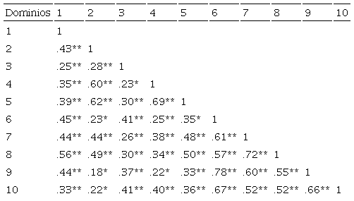 Posteriormente se llevaron a cabo correlaciones Pearson y análisis de varianza One Way con fines descriptivos de relaciones entre categorías, dominios y dimensiones consigo mismas o/y otras variables. Primero se hicieron correlaciones entre los 10 dominios estudiados (ver Tabla 5)