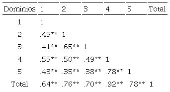 De la Tabla 5 se puede apreciar que todos los dominios están altamente correlacionados con el valor más bajo del .18 y el más alto del .78 destacadamente, el dominio 1 con los dominios 6 (.45) y 8(.56); el dominio 2 con los dominios 4(.60) y 5(.62); el dominio 3 con 6 y 10 (ambos con .41); el dominio 4 con 5 (.69) y 10 (.40); el dominio 5 con 7(.48) y 8 (.50); el dominio 6 con 9 (.78) y 10 (.67); el dominio 7 con 8 (.72) y 9 (.60); el dominio 8 con 9 (.55) y el dominio 10 particularmente con el 6 (.67).