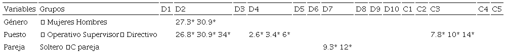 Finalmente, se llevaron a cabo análisis de varianza de una sola vía (ver Tabla 7) también con fines descriptivos de la muestra correspondiente, en la que destacan tres variables: género, puesto y pareja. En el caso del género (mujer, hombre) y el puesto (operativo, supervisor y directivo), éstos se relacionan con el dominio 2 donde se aprecia que la mayor percepción de carga de trabajo la reportan los hombres y con actividades de dirección y supervisión (<=.05); también se observa que quienes reportan mayores problemas con su jornada de trabajo son los directivos y supervisores (<=.05); quienes reportan mayores problemas con sus relaciones en el trabajo son las personas que cuentan con pareja; finalmente, la categoría general de organización del tiempo de trabajo reporta de manera significativa problemas con los puestos directivos y de supervisión (<=.05). Ver Tabla 7.