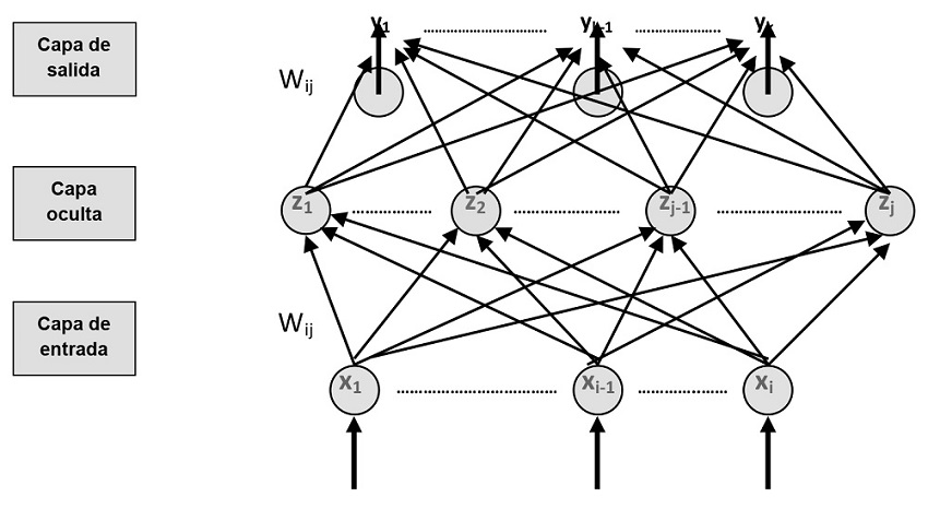 El Perceptrón Multicapa (MLP) es un modelo de red neuronal artificial supervisada, de alimentación hacia delante, que está compuesta por una capa de unidades de entrada (sensores), otra capa de salida y un número determinado de capas intermedias, denominadas capas ocultas en tanto que no tienen conexiones con el exterior. Cada sensor de entrada estaría conectado con las unidades de la segunda capa, éstas a su vez con las de la tercera capa, y así sucesivamente (Figura 1). La red tendrá como objetivo establecer una correspondencia entre un conjunto de datos de entrada y un conjunto de salidas deseadas.
