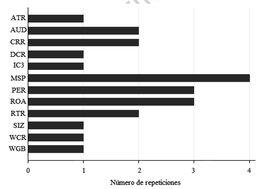 Como se señala anteriormente, los resultados obtenidos señalan un conjunto de variables significativas que se repiten en prácticamente la totalidad de las metodologías utilizadas (Figura 3). Una de esas variables es el tamaño del mercado provincial donde se encuentra el club (MSP), y que ha resultado significativa en los cuatro métodos. El mayor tamaño del mercado está relacionado con un mayor nivel de ventas y de asistencia al estadio, y se encuentra muy vinculado a la rentabilidad económica del club (Barajas y Rodriguez, 2010; Scelles, Szymansk y Dermit-Richard, 2016). Por su parte, la variable rendimiento deportivo (PER) ha sido un ratio recurrente en tres métodos, reflejando la importancia de la evolución de los resultados deportivos del club, muy relacionada con una mayor capacidad de generar ingresos por éxitos deportivos provenientes de los organismos administradores de las competiciones e ingresos por otros conceptos como los derechos televisivos (Barajas y Rodriguez, 2010; Buraimo, Paraimo y Campos, 2010). Por último, la variable de rentabilidad sobre activos (ROA) ha resultado también significativa en tres de los cuatro métodos utilizados. ROA es una variable de gran importancia para la viabilidad financiera empresarial, tal y como ha sido contrastada en numerosos estudios previos sobre predicción de insolvencia (por ejemplo, Atiya, 2001; Callejón., Casado, Fernández y Peláez, 2013; Hu y Tseng, 2005; Lin y Piesse, 2004). Por tanto, los clubes que muestran un tamaño de mercado reducido (MSP), un bajo ratio de rendimiento deportivo (PER) y una escasa rentabilidad sobre activos (ROA) tienen más probabilidad de recibir una opinión de going concern.