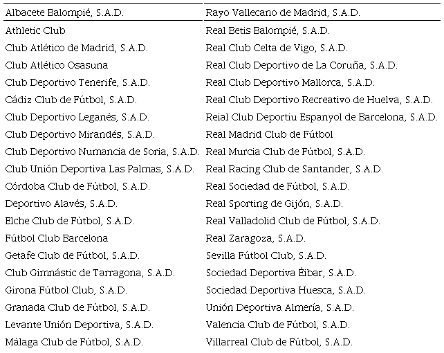 La presente investigación utiliza una muestra de 40 clubes españoles profesionales de fútbol que han participado en Primera y en Segunda División Española durante el período 2005-2016, y que han cumplido la característica de proporcionar información pública y completa de sus cuentas anuales (Tabla 1). La información financiera de los clubes de la muestra ha sido obtenida de la base de datos Sistema de Análisis de Balances Ibéricos (SABI) de Bureau Van Dijk, que proporciona datos económicos y financieros de más de un millón de empresas españolas. Por su parte, la información de las variables propias de la industria del fútbol ha sido extraída del portal web Transfermarkt.