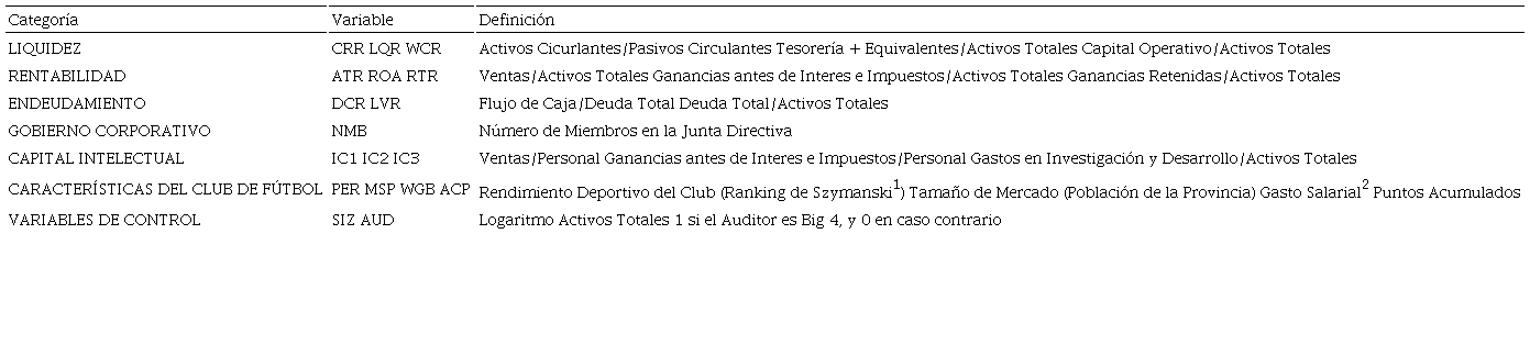 Por su parte, las variables independientes han sido seleccionadas de la literatura previa sobre predicción de going concern (Koh y Low, 2004). Además, se seleccionaron otras variables propias de la industria futbolística (Barajas y Rodríguez, 2010, 2014). La Tabla 2 muestra la definición de las variables utilizadas. En total, se trata de un set de 18 variables que incluyen 8 ratios financieros, 8 indicadores no financieros y 2 variables de control. En particular se incluyen variables de liquidez, ya que se consideraron determinantes en la decisión de calificar con going concern las opiniones de auditoría (Anandarajan y Anandarajan, 1999; Yeh et al., 2014; Martens, 2008; Hung y Shih, 2009; Goo, et al., 2016). También se incluyen variables de rentabilidad (Anandarajan y Anandarajan, 1999; Hung y Shih, 2009; Martens et al., 2008) y variables de endeudamiento (Anandarajan y Anandarajan, 1999; Hung y Shih, 2009; Martens et al., 2008). Para completar la selección de variables independientes, hemos incluido variables sobre el gobierno corporativo, consideradas en la literatura previa como factor de riesgo de información financiera (Beasley, 1996; Hung y Shih, 2009; Wang y Deng, 2006) y variables que se refieren al capital intelectual, pues se acepta que tienen un papel importante en términos de asegurar un mayor beneficio económico (Yeh et al., 2014). Asimismo, se incluye otras variables relacionadas con las características de los clubes de fútbol tales como el tamaño del mercado en el que opera el club, el gasto salarial y los puntos acumulados en las competiciones en las que participa (Barajas y Rodríguez, 2010; 2014). Finalmente, como variable de control hemos utilizado el tamaño del club, pues se ha demostrado que el tamaño de las empresas está significativamente asociado con las calificaciones going concern (Anandarajan y Anandarajan, 1999; Ireland, 2003). También el tipo de auditor, ya que las grandes auditoras tienden a publicar informes más conservadores (Ireland, 2003; Martens et al., 2008; Yeh et al., 2014).