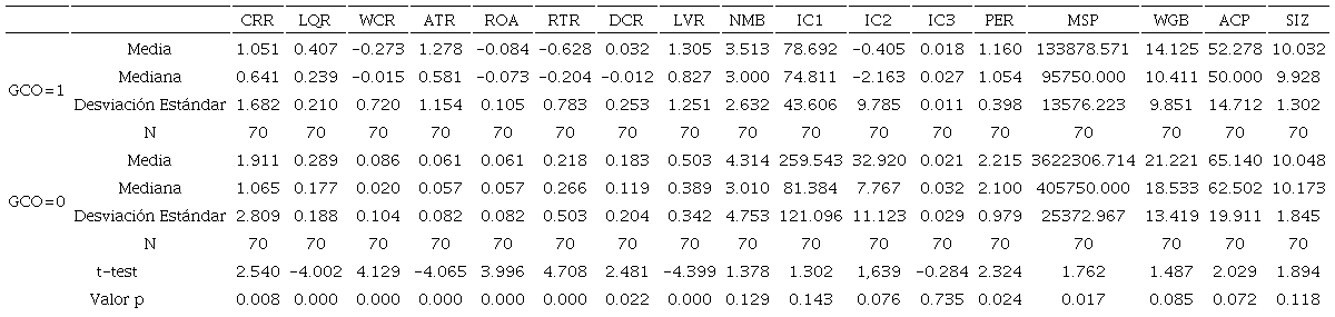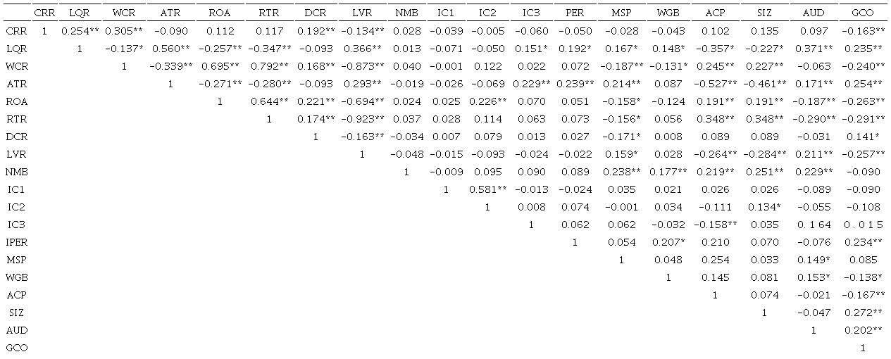 Los principales estadísticos descriptivos de las variables que componen la muestra aparecen en la Tabla 3. Los clubes de fútbol con una opinión de going concern (GCO = 1), en comparación con los que no la tienen (GCO = 0), se caracterizan por un mayor valor medio de liquidez (LQR), una mayor proporción de ventas en relación al activo total (ATR) y un mayor nivel de endeudamiento (LVR). Por el contrario, en el resto de variables, presentan menores valores medios. Además, también se deduce una moderada dispersión en la distribución de las variables analizadas, que es extensible a toda la muestra. Por su parte, la Tabla 4 muestra la correlación entre las variables. De acuerdo con los resultados obtenidos se puede deducir que las variables independientes presentan una alta correlación respecto a la variable dependiente (GCO), con algunas excepciones. Ello permite inferir que, en principio, el set de variables seleccionado puede ser apropiado para el desarrollo del modelo de perseguido.