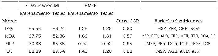 En la Tabla 5 se presentan los resultados de clasificación obtenidos con los distintos métodos propuestos. Se observa que las variables explicativas que han resultado significativas coinciden en la selección realizada por la mayoría de métodos. También que los mayores grados de precisión se obtienen con MLP y DT (en torno al 90%), mientras que con Logit y MDA la precisión es inferior (alrededor del 80%). Estos resultados son coherentes con las conclusiones de Jones, Johnstone y Wilson (2017), que en su estudio sobre un análisis comparativo entre métodos de clasificación aplicados a la predicción de dificultades financieras concluyen que los métodos computacionales son más precisos, aunque las técnicas estadísticas siguen ofreciendo resultados fiables.