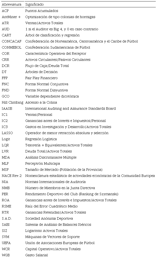 El presente estudio pretende arrojar luz en la investigación sobre la predicción de la opinión de auditoría sobre going concern en la industria del fútbol. Para ello desarrolla un nuevo modelo exclusivo para la industria. En la construcción de este nuevo modelo se ha utilizado información financiera y no financiera del período 2005-2016 correspondiente a una muestra de 40 clubes españoles de fútbol profesional, lo que ha proporcionado un total 140 observaciones/año, la mitad de ellas de clubes en going concern y la otra mitad sin esta calificación. A los datos de dicha muestra se han aplicado diferentes metodologías (regresión logística, análisis multidiscriminante múltiple, redes neuronales artificiales y árboles de decisión), que se han sido utilizadas con éxito en la literatura previa sobre predicción de going concern (Inoue y Kilian, 2005; Martens et al., 2008; Yeh et al., 2014). Los resultados obtenidos nos han permitido conocer qué factores son los mejores predictores de la continuidad en la industria futbolística, con tasas de precisión superiores al 90%. Estos resultados son importantes para los diversos grupos de interés en la industria, como auditores, inversores, gestores de clubes y órganos de gobierno, a los que ayudaría a un mejor control financiero de los clubes.