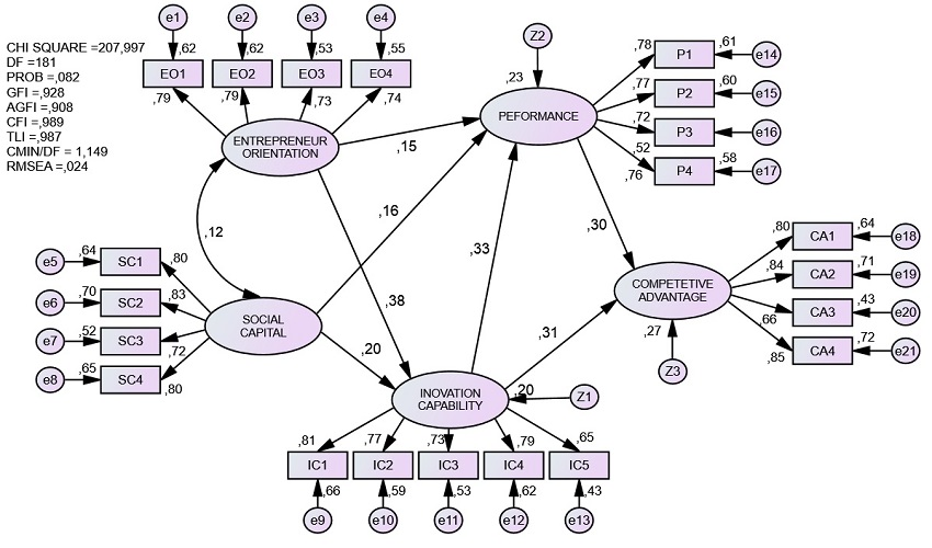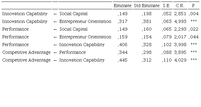The results of data analysis by using AMOS program showed that the estimation parameter of Entrepreneur Orientation influence on innovation capability (β1), showed the significant result with standardized estimate value β1 = 0,317, and critical ratio (CR) 4,993 and p-value = ***. These values have met the acceptance requirements of the hypothesis that the value of CR> 1.96 at the level of significance <0.05 (P = ***). Hypothesis 1 (H1) is supported, the higher the entrepreneurial orientation conducted by SMEs, the higher the innovation capability. The influence of social capital on innovation capability shows a significant result with standardized estimate value β1 = 0,149, and critical ratio (CR) equal to 2,851 and p-value = 0,004. CR value> 1.96 at significance level <0.05. Hypothesis 2 (H2) is supported and has a significant effect. Entrepreneurial orientation has a significant effect on performance with standardized estimate value β3 = 0,159, and critical ratio (CR) equal to 2,017. and p-value = 0,044. These values have met the acceptance requirements of the hypothesis that the value of CR> 1.96 at the level of significance p-value <0.05. Hypothesis 3 (H3) is supported and significant. Social capital has significant influence on Performance (β4), with standardized estimate value β4 = 0,149 and critical ratio (CR) 2,293 and p-value = 0,022. These values have met the acceptance requirements of the hypothesis that the value of CR> 1.96 at the level of significance p-value <0.05. Hypothesis 4 (H4) is supported and significant. The effect of innovation capability on Performance (β5) is significant with the value of standardized estimate β5 = 0.406 and critical ratio (CR) of 3.998 and (P = ***). CR value> 1.96 at p-value significance level <0.05. Hence, hypothesis 5 (H5) is supported and significant. Innovation capability have significant effect on competitive advantage with standardized estimate value β4 = 0,445 and critical ratio (CR) 4,209 and (P = ***), CR value> 1.96 at level significance of p-value <0.05. Hypothesis 6 (H6) is supported and significant. Performance has significant effect on competitive advantage with value of standardized estimate β7 = 0,344 and critical ratio (CR) equal to 4,029 and (P = ***). Furthermore, hypothesis 7 (H7) is supported and significant.
