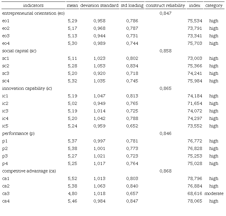 The entrepreneurial orientation is measured by indicators of innovation ability, proactivity, and risk-taking courage. Social capital is measured by cognitive capital, structural capital and relational capital. Innovation capability consists of product innovation, process innovation, innovation administration, innovation marketing, and service innovation. Competitive advantages consist of low cost, quality of products or services, R & D, and innovation. Everything is measured by using Likert scale 1 to 7, 1 for strongly disagree and 7 for strongly agree.