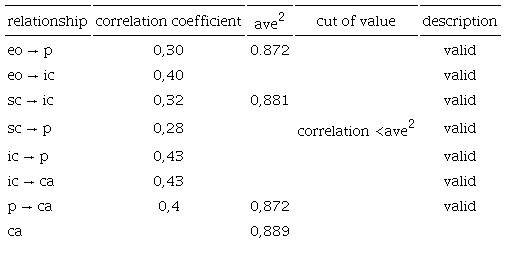 Test outlier data with Chi-square value (χ2) to distance-squared mahalanobis values at 1% level of degree with degree of freedom number of variables observed in research model. If there are observations that have a distance-squared mahalanobis greater than Chi-squared and / or p1 or p2 value less than 0.001, then the observations are excluded from the data tabulation. Based on the results, the observation data have met the requirement, because it has distance-squared mahalanobis value with p2 value greater than 0.001. Thus, the data does not contain multivariate outlier symptoms. There is distribution of data to meet the assumption of normality both univariate and multivariate normality. It can be seen from the coefficient c.r skewness and kurtosis that have value lower than ± 2.58 (Z = 0,05 / 2). Detection of symptoms of multicollinearity and singularity can be seen in the determinants of the sample covariance matrix. If the determinant of the sample covariant matrix is equal to zero (0) then the data is not yet free from multicollinearity. The results of data show that the determinant value of the sample covariance matrix is greater than zero. This means that the data are free from multicollinearity.