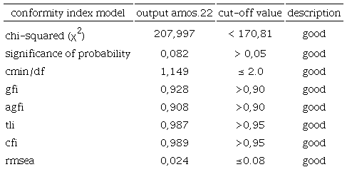 The results of conformity model indicate that all criteria are met so that the model is categorized as good. The value of each index produced from the analysis of this research data is shown in Table 4.