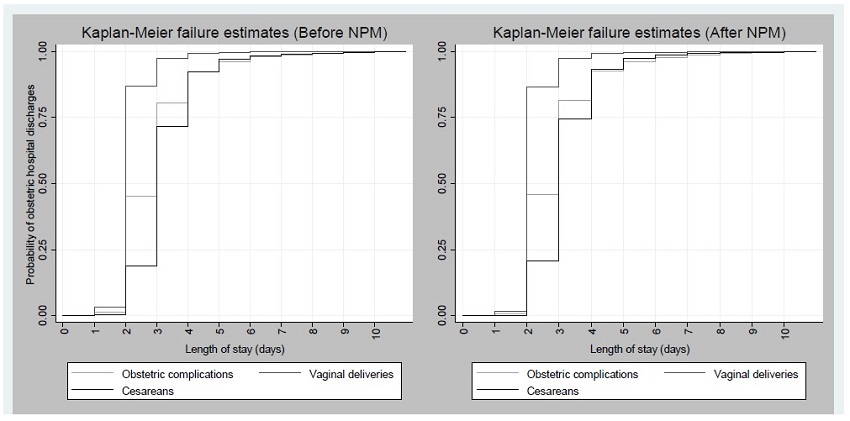 In order to explore the relationship between HDs and LoS, we performed survival analysis and found homogeneous results in the number of days required to produce a HD, irrespective of the type of obstetric care provided (Figure 3). Regarding cesarean delivery services, the probability of a HD on the same day of admission was zero, both before and after NPM implementation. However, the cumulative probability of a HD on the fourth day slightly increased following NMP implementation (75% versus 63%).