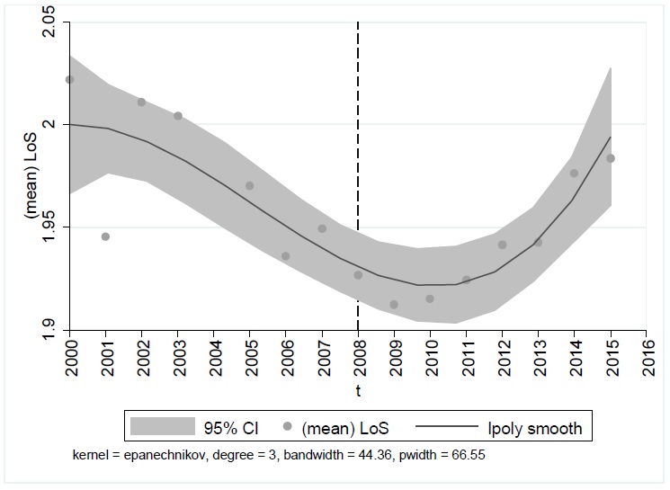 Average LoS (outcome variable) was modeled via kernel-weighted local polynomial regression methods (Welsh, 1996) using the Epanechnikov function and a polynomial degree of 3 (Deng & Chu, 2010); its trend was modeled as a function of time (t = year of occurrence of a HD). Kernel weighted local regression estimate nonparametric explanatory variables effects (Yu & Lin, 2008). This procedure is adequate to represent (graphically) the non-linear relationship between an explanatory factor (years of following) and the result (average of hospital stay). All analyses were performed on Stata version 14.
