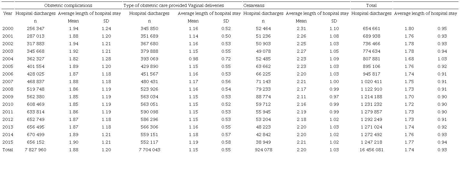 Table 1 displays the number of HDs and average LoS by year and type of care. Over the study period, the average LoS culminating in a HD - regardless of the type of care provided - was 1.74 days (SD, 0.93 days). When considering average LoS by type of care, vaginal deliveries required only 1.15 days (SD, 0.55 days) to produce a HD, as opposed to 2.20 days (SD, 1.03 days) in the case of cesarean deliveries. Temporal analysis indicated a highly homogeneous distribution of LoS over time: 2000 registered the longest (1.80 days; SD, 0.95 days) and 2004 the shortest LoS averages (1.68 days; SD, 1.03 days) (Table 1).