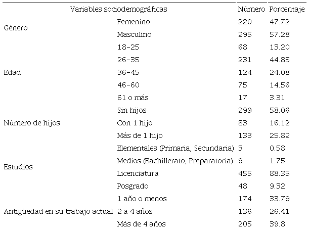 La muestra inicial consistió en aplicar el instrumento a 557 auditores de organizaciones del sector público en México (variables sociodemográficas Tabla 1) del 27 de Julio al 2 de Agosto de 2016. Se realizó una muestreo basado en cuotas con auditores del ámbito subnacional (Entidades de Fiscalización Superior Local “EFSL” y de las Contralorías de los Estados “C” de las 32 entidades federativas) quedando integrada por 426 servidores públicos de los Estados y 131 auditores del ámbito federal (Tablas A1 y A2, en Anexos), de ellos 42 cuestionarios resultaron no válidos debido a que no se obtuvo respuesta, el error muestral fue de 3.86%, nivel de confianza a intervalo: 95%, z=1.96; p=q=0.5. De la aplicación de los cuestionarios semiestructurados resultaron 515 válidos, de los cuales 295 fueron respondidos por hombres (57.3%) y 220 por mujeres (47.7%), el 88.35 % de los auditores cuenta con licenciatura como el nivel máximo de estudios, el 82.1% (423) tienen una edad entre los 18 a 45 años, aunque con un promedio de antigüedad cercano a los 4 años y trabajan aproximadamente 51 horas a la semana.