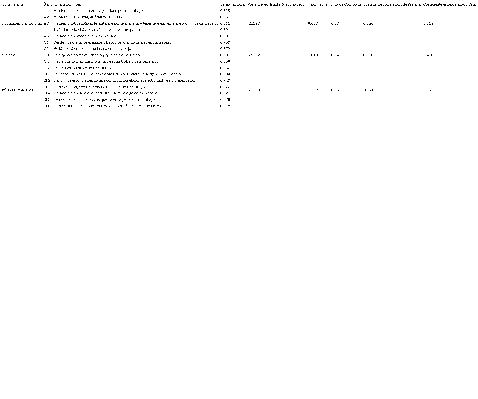 Con los datos obtenidos, se realizó un análisis factorial exploratorio de componentes principales con rotación Varimax. El coeficiente Kaiser-Meyer-Olkin obtenido fue de 0.903 y una prueba de esfericidad de Barlett con un Chi- cuadrado de 4 649.461; g.l. 120; p <0.000. La finalidad fue identificar aquellos ítems que no estaban adheridos a su dimensión (Hair, Black, Babin, Anderson y Tatham, 1998; Lámbarry, Rivas y Trujillo, 2013) y el grado de dimensionalidad de sus respectivas cargas factoriales (Tabla 2). Cada una de las sub-escalas presentaron un buen grado de unidimensionalidad, con cargas factoriales que superan valores por arriba de 0.4 (Landero y González, 2009). Derivado de esto, resultaron tres componentes principales que explican el 65.13% de la varianza del burnout, confirmándose la multidimensional (agotamiento emocional, cinismo y eficacia profesional) del constructo compuesto por 16 ítems.