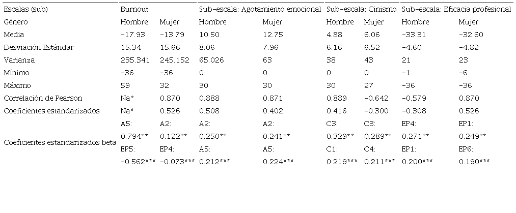En cuanto a los coeficientes estandarizados Beta obtenidos de la regresión lineal múltiple, las sub-escalas inciden en el síndrome en forma muy similar con valores muy aproximados, independientemente del género del auditor; en mayor grado se encuentra agotamiento emocional y en menor grado eficacia profesional, tendencia que se visualiza también al observar el porcentaje de varianza explicada por cada sub-escala (Tabla 2). A nivel indicador, A2, me siento acabado(a) al final de la jornada es el que mayor incide con un coeficiente estandarizado de 0.122 para las mujeres, mientras que, para los hombres resulta ser C3 sólo quiero hacer mi trabajo y que no me molesten con un valor estandarizado de 0.132, aunque estos dos indicadores son los dos más determinantes del burnout para ambos sexos.
