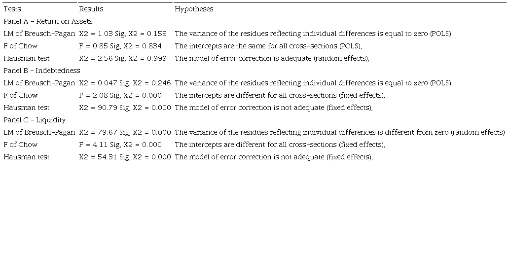The tests determined the fixed effects as the most appropriate approach for the treatment of the data of the models of indebtedness and liquidity, and the random effects approach as that for the profitability model. A better detailing of the data analysis will be presented in the following section.