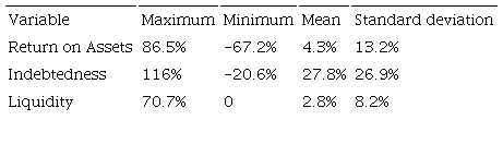 To begin the analysis of the data, the descriptive statistics of the return on assets, indebtedness and liquidity is shown in Table 2.