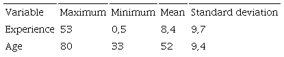 In the following, we developed the descriptive analysis of the independent variables: experience, age, experience in the sector, duality, level of training, kinship, gender and origin. Table 3 presents the results of the variables experience and age.