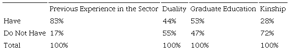 Experience accompanies age. Thus, it is possible to state that older managers usually have a longer term of office, which benefits the organization (Cline & Yore, 2015). However, there is not a consensus regarding the appropriate period of experience and age. The analysis of the characteristics related to their previous performance in the company sector, duality, graduate education and kinship are illustrated in Table 4.