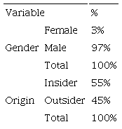 The next independent variable presented refers to the origin of the executive, whether s/he comes from another organization or was an employee of the company. Over 50% of managers in the presidency had been hired from other organizations. The numbers in Brazil differ from the world numbers. In the research conducted by the Harvard Business Review (2015), approximately 74% were insiders. In India, for example, this proportion was 63%, while in Japan approximately 90% rose from a position in the company. Inside executives perform better in the United States, United Kingdom and Latin America, while outsiders perform better in Continental Europe, India and China.