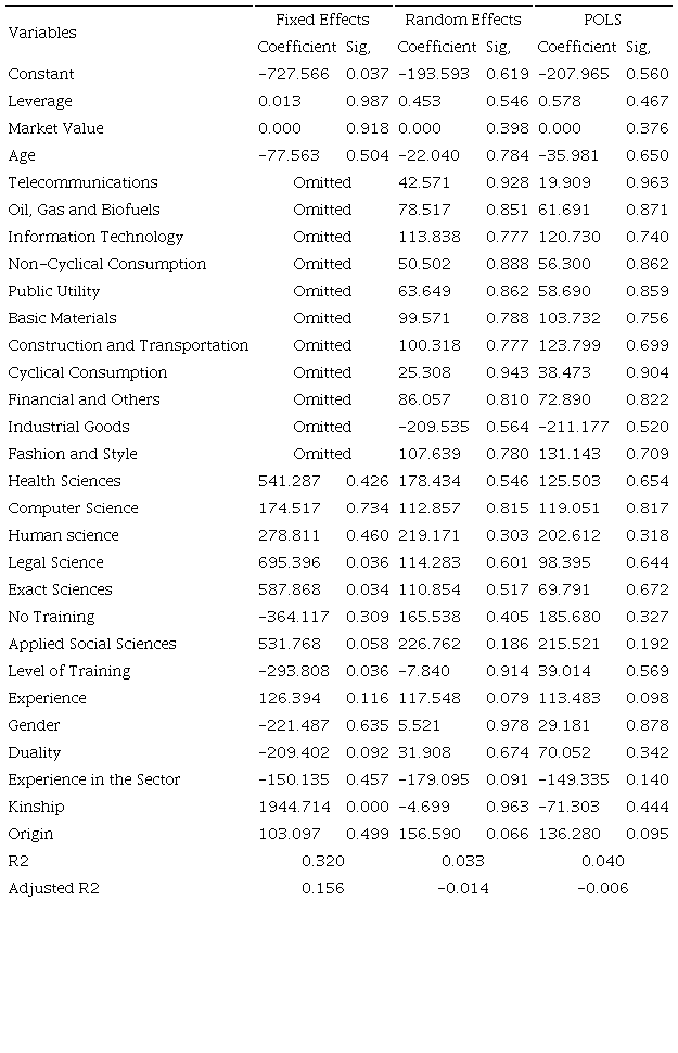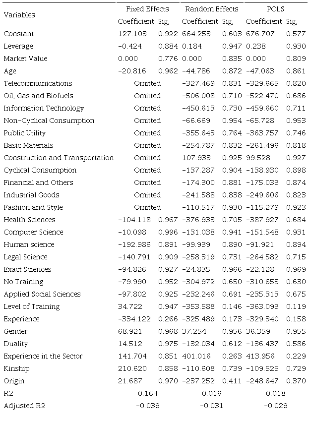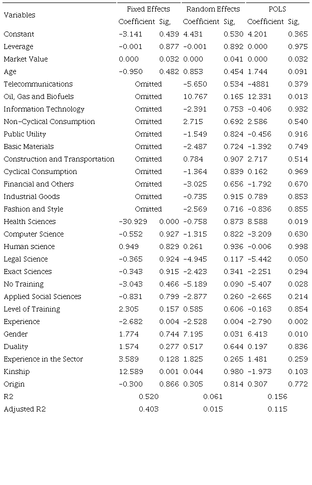 The other hypotheses that address the positive influence of the gender, age and origin of CEOs are not significant in any of the analysis models. Thus, it was not possible to delineate a positive or negative relationship with performance.