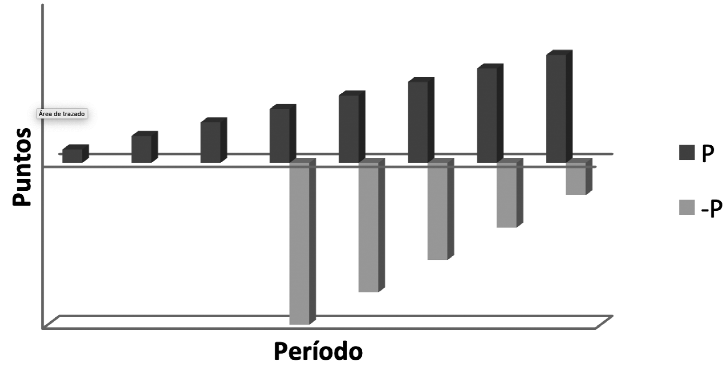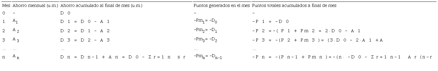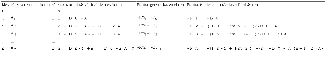 En esta banca no existe la capitalización compuesta, puesto que los puntos de ahorro no generan, a su vez, más puntos de ahorro, sino que éstos se devengan únicamente sobre el capital depositado. La Tabla 1 muestra la generación de los mismos en un depósito, donde las cantidades son entregadas de forma prepagable, esto es, al comienzo del mes. Es importante señalar que la retirada de fondos del depósito no genera puntos negativos; simplemente, la cuantía retirada dejará de generar puntos positivos en un futuro, conservándose todos los puntos obtenidos con anterioridad.