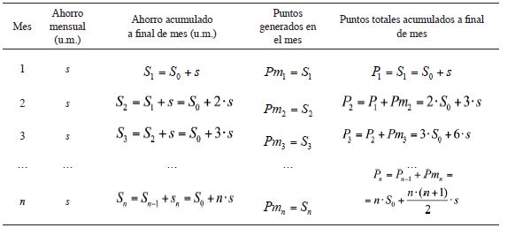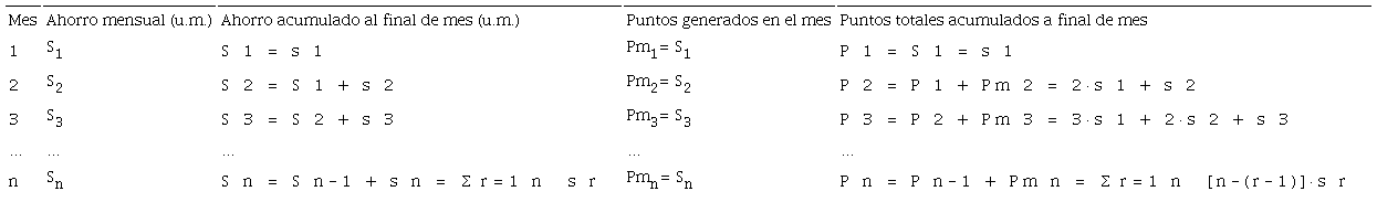 Es usual que el ahorro se realice mediante la entrega de cuantías mensuales constantes. La Tabla 2 muestra la evolución de las diferentes magnitudes en este caso, considerando, además, la posibilidad de que exista un saldo previo, S0 , que genere también puntos de ahorro. En efecto, los puntos de ahorro totales generados con el depósito, Pn , son la suma de los saldos habidos al final de cada período, esto es, la suma de una serie de términos variables en progresión aritmética, de modo que: