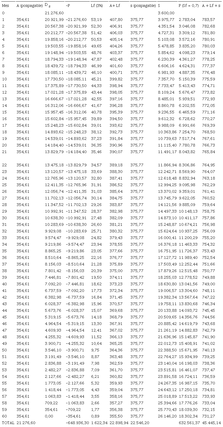 resulta que el ahorro constante, s, que tendrá que realizar, de modo prepagable, cada uno de los 60 meses de amortización es igual a 375,77 euros.
