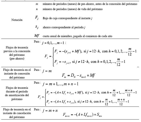 En el instante de concesión del préstamo, esto es, al final del m-ésimo período, el flujo de tesorería estará compuesto por el capital que realmente necesita el prestatario (cobro del principal del préstamo menos el depósito de seguridad), menos la cuota de ahorro necesaria correspondiente a cada período (mes) de vida del préstamo, menos la cuota anual de miembro, en el caso de que el pre-ahorro tenga lugar durante un número entero de años y, en consecuencia, corresponda su pago en ese instante (en otro caso, es fácil hacer la adaptación oportuna).