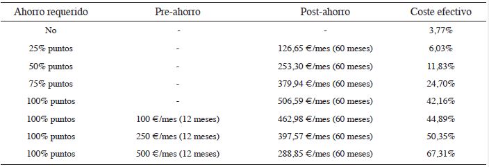 Para ilustrar mejor estas afirmaciones, consideremos diversas alternativas, tal como se ilustra en la Tabla 6. En primer lugar, dada la situación de no requerir ahorro al prestatario, ni pre-ahorro ni post-ahorro, porque se han obtenido de donaciones realizadas por terceros los puntos de ahorro positivos necesarios para equilibrar la operación, según las condiciones de JAK, el coste efectivo del préstamo es igual a 3,77% y representa la situación óptima que genera el mínimo coste efectivo posible para este tipo de préstamos. A medida que las donaciones de puntos no cubren todos los puntos positivos necesarios, y éstos hubieran de generarse con post-ahorro, se observa cómo el coste efectivo aumenta conforme el ahorro necesario es mayor. Asimismo, si el ahorro requerido se obtuviese, además, con pre-ahorro, entonces el coste seguiría aumentando en consonancia con el mayor pre-ahorro realizado. Todo ello es consecuencia de la indisponibilidad de fondos inmovilizados durante un largo período y sin remuneración alguna.