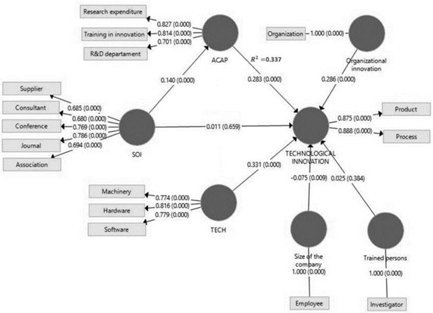 Abstract: Greater attention should be given to low- and medium-low- tech companies in emerging countries because they contribute a significant share of GDP and employment in their economies. However, innovation practices of these companies have not taken yet the attention of innovation scholars. This article proposes a model to study how absorptive capacity, perceived impact of information sources and expenditure in acquisition of technology are associated with technological innovation practices in Peruvian low- and medium-low-tech manufacturing companies. A sample of 856 manufacturing companies of low- and medium-low- tech was obtained from the first National Survey of Innovation in the Manufacturing Industry carried out in 2012. A SEM model is proposed and has been analyzed using a partial least squares approach. Our study reveals that absorptive capacity is associated to improve technological innovation, that perceived impact of information sources are important for absorptive capacity and that greater importance should be given to the acquisition of technology: machinery, hardware and software.