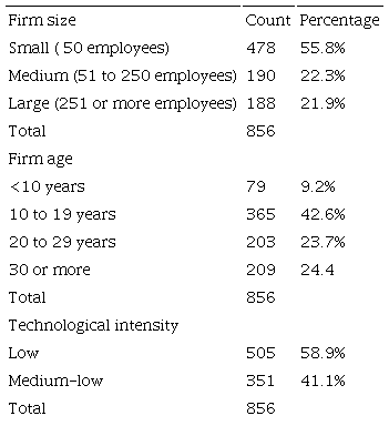 For this empirical study, we use the data collected in the National Survey of Innovation in the Manufacturing Industry 2012 (INEI Survey, 2012), a survey applied to companies in the Peruvian manufacturing sector to obtain information about their innovation processes, determinants and specific characteristics. The survey was conducted during the reference period 2009-2012. The sample consisted of 1 220 companies, large, medium and small, from different regions of the country; places where more than 90% of the production value of manufacturing activity is generated nationwide. For the study, 856 companies of low and medium low technology intensity were identified. The design of this survey was developed on the basis of the methodological framework of the “Bogotá Manual”, which in turn will allow the development of indicators comparable to the results of other countries in the Latin American region. In the Table 1, we present information about firm size (according to the number of employees), the firm age and the number of companies according to its technological intensity.