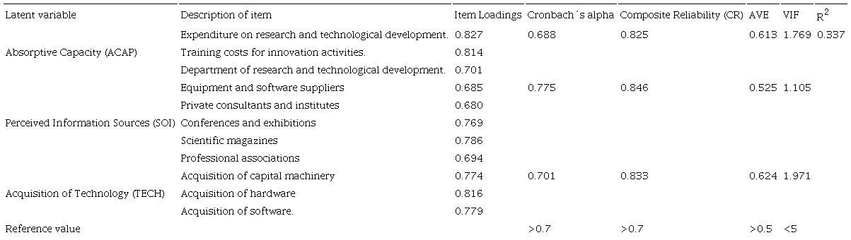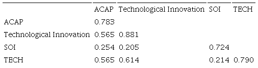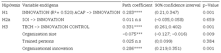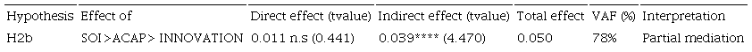 First, we examine collinearity using the Variance Inflation Factor (VIF), which must be found below 5. Looking at Table 6, collinearity is not a problem among the constructs of the structural model. Second, the non-parametric bootstrap procedure with 2 000 subsamples was used to generate the path coefficients and 90% confidence intervals (Chin, 1998). Table 8 shows the results. Third, the indirect effect has to be significant, since it is an indispensable requirement to evaluate the importance of the mediating effect (Hair Jr et al. 2014; Preacher & Hayes, 2008). In the study, the direct relationship between perceived impact of information sources and technological innovation is not significant, but its indirect effect through absorptive capacity is significant (b = 0.039 ****, t = 4.470) considering indirect mediation. The results are presented in Table 9. In order to complement, we present the Variance Accountant For (VAF), which determines the indirect effect in relation to the total effect; 78% of the VAF is obtained through the absorptive capacity, which explains the perceived impact of information sources and technological innovation.