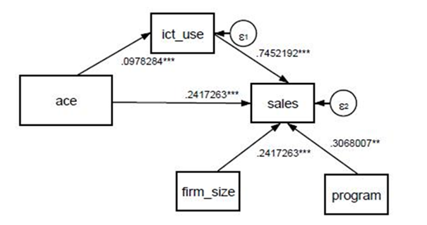Therefore, ACE has a direct effect on Sales (β=0.2417) and an indirect effect mediated by ICT use (0.072=0.0978*0.7452). Hence, ACE’s total effect is the sum of the direct and indirect effects (0.072).